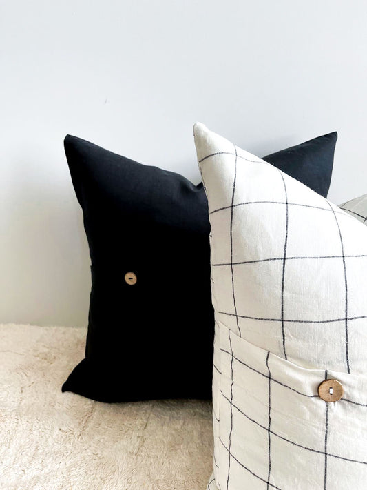 Pure French Linen Cushion Cover - Black Grids