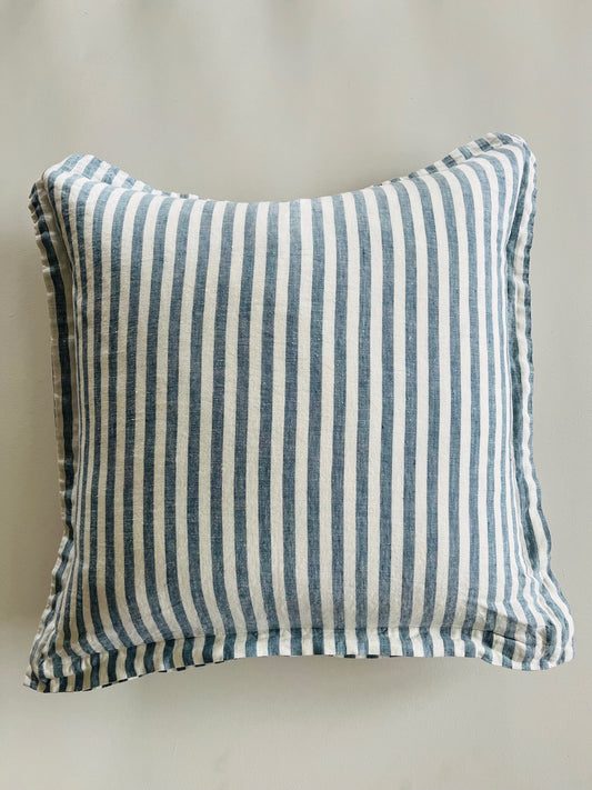 Pure French Linen Cushion Cover with Flange Detail - Stone Blue Stripe