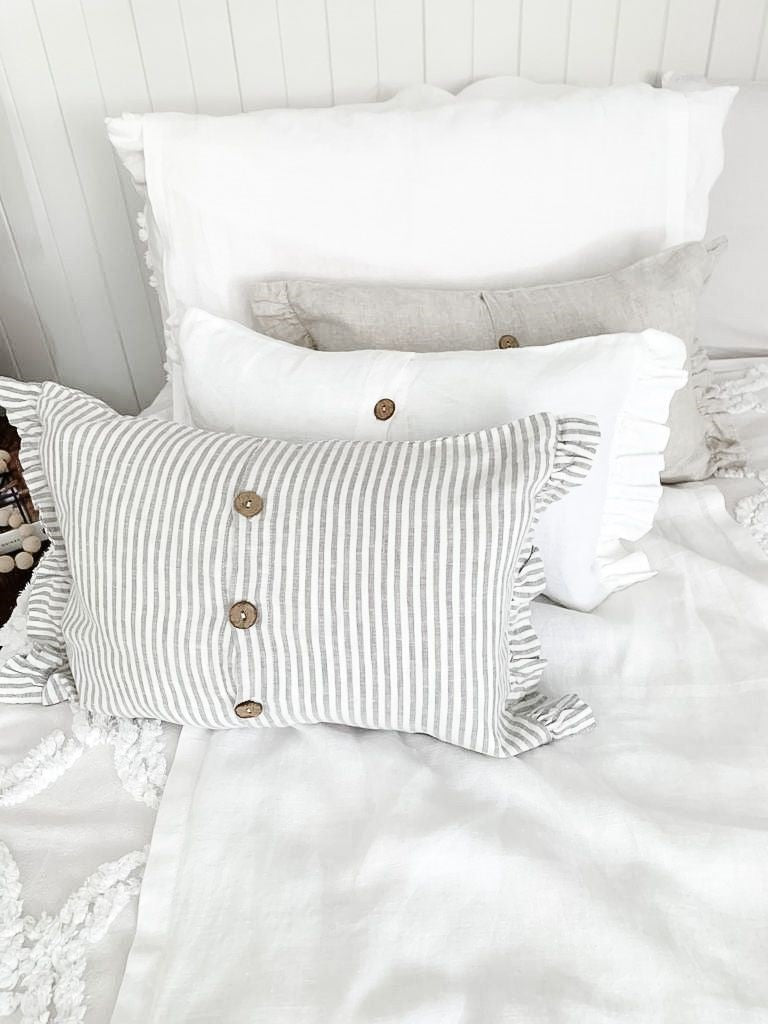 Elevate your home decor with the timeless elegance of our Pure Linen Lumbar Cushion Cover with Ruffle Detail and 3 wooden coconut buttons on the front side. Handcrafted from the finest pure linen fabric, this exquisite cover is designed to add a touch of sophistication and refinement to any room.